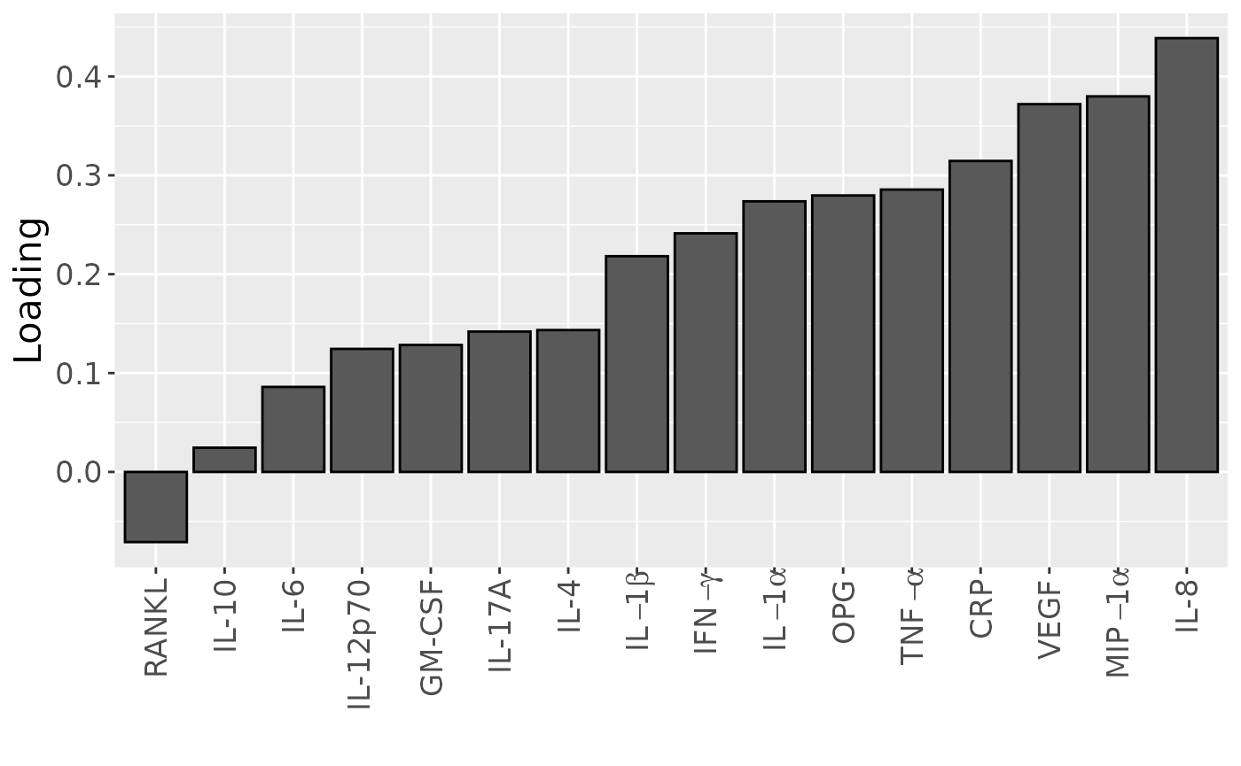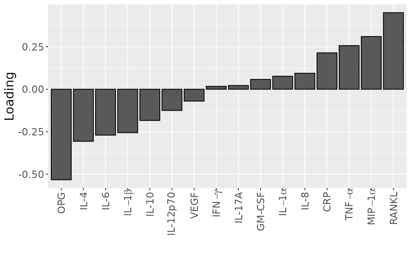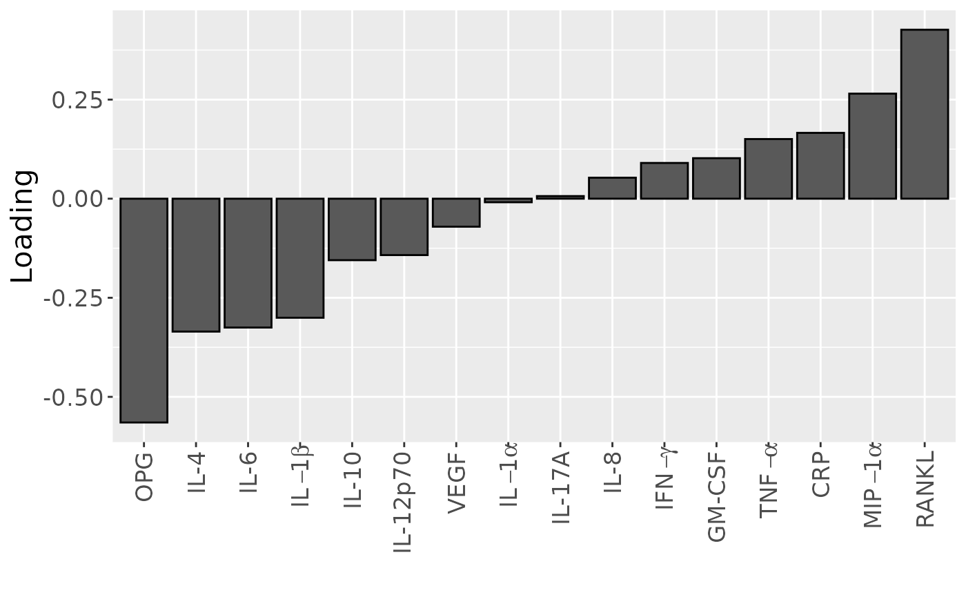 scale_x_discrete(labels=c("OPG", "IL-4", "IL-6", expression(IL-1*beta), "IL-10", "IL-12p70", "VEGF", expression(IFN-gamma), "IL-17A", "GM-CSF", expression(IL-1*alpha), "IL-8", "CRP", expression(TNF-alpha), expression(MIP-1*alpha), "RANKL")) +