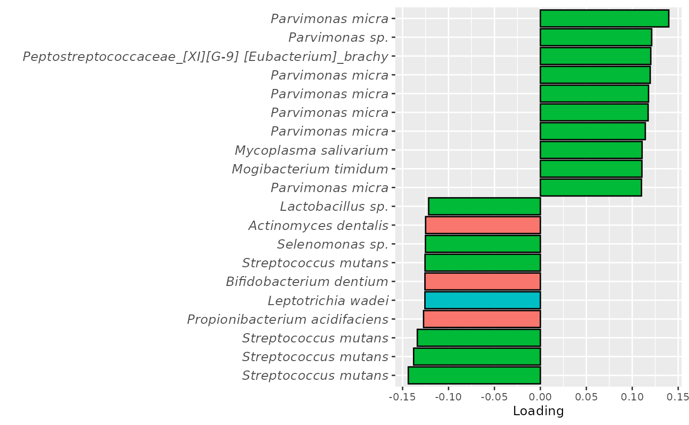 Positively loaded microbiota included Parvimonas micra, Parvimonas sp., Solobacterium moorei, Mycoplasma salivarium, and Peptostreptococcus stomatis, which were enriched in symptomatic AP and depleted in asymptomatic AP. Conversely, negatively loaded microbiota included Streptococcus mutans, Propionibacterium acidifaciens, Selenomonas sp., Lactobacillus sp., Bifidobacterium dentium, and Leptotrichia wadei, which were enriched in asymptomatic AP and depleted in symptomatic AP. These associations largely align with the previously presented PLS and NPLS results, but are confounded by age to some degree.